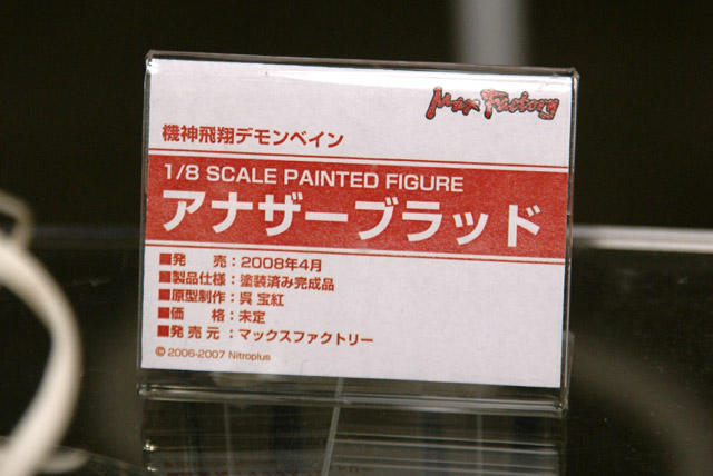 11月25日に開催された、ホビーコンプレックス 02東京のグッドスマイルカンパニーブースでは、マックスファクトリー「機神飛翔デモンベイン アナザーブラッド」の無彩色サンプルが展示されていました。これは、以前ワンフェス2007夏でもサンプル展示のあった、「機神飛翔デモンベイン」のキャラ「アナザーブラッド」を立体化したものです。これは良い「見せてんのよ」ポーズw