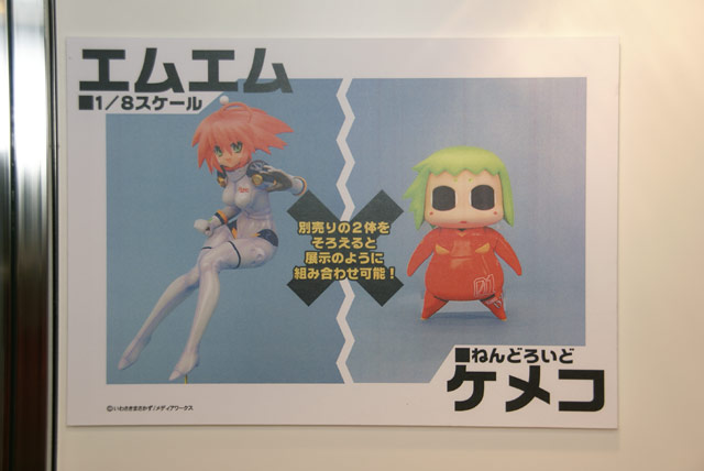これは、2008年にアニメ化されることが発表された、月刊電撃コミック ガオ!で連載中のいわさきまさかず氏著書のコミック「ケメコデラックス!」の「エムエム」と「ケメコ」をそれぞれ立体化したもので、展示されていたものは、その2つを組み合わせ、1巻の表紙イラスト(AA)を再現した状態のサンプルでした。