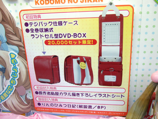 なお、展示されていたものはテストサンプルで、背負ったランドセルはおそらくDVD「こどものじかん 1科目 初回限定」(AA)に付属のもので、商品には含まれないものとおもいますので、こんな感じになるんだなという、目安程度にご覧くださいな〜。