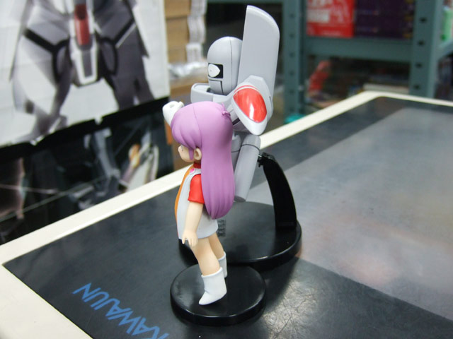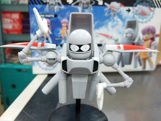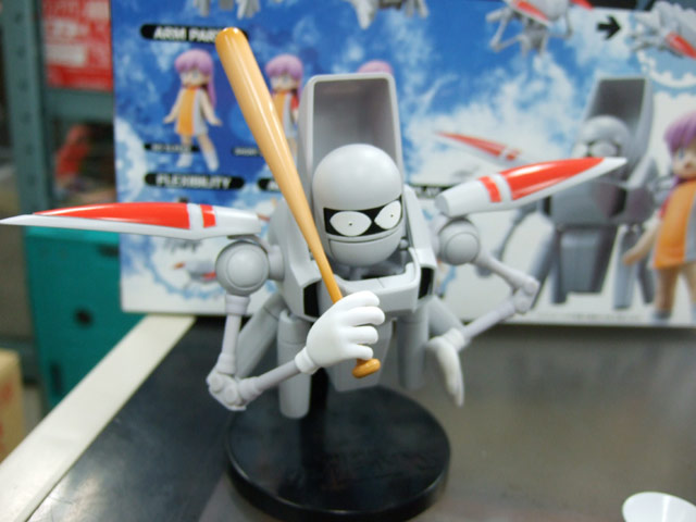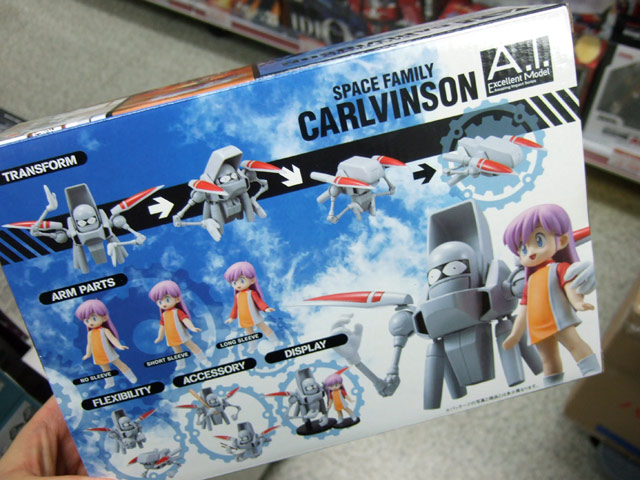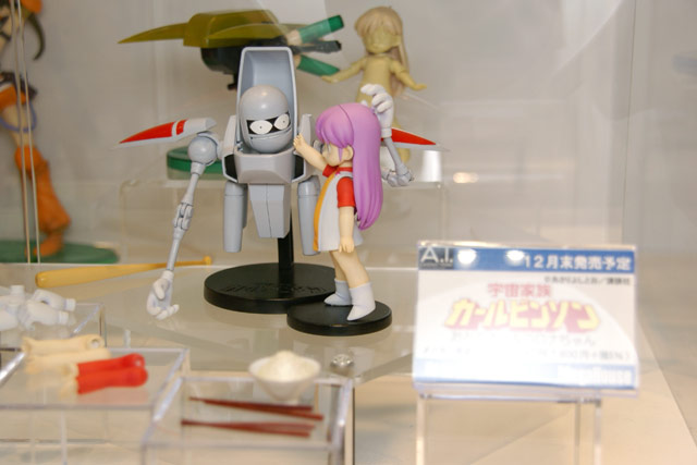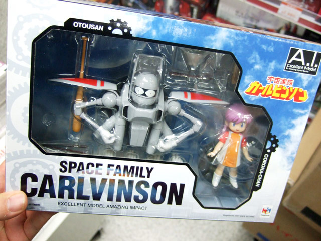 これは、ワンフェス2007夏でもサンプル展示のあった、Wikipediaによると「掲載紙が2度変わっており、その度に1から連載を行っているため、3つの世界観に分かれている。〜通常はもっとも長期にわたって連載された少年キャプテン版のことを指す。1988年にOVA化もされている。」というあさりよしとお氏著書のコミック「宇宙家族カールビンソン」のキャラ「おとうさん」と「コロナ」を立体化したもので、Amazonの商品説明によると『奇才・あさりよしとおの描く、伝説のSFアットホームコメディ作品「宇宙家族カールビンソン」が、完成品フィギュアとしてついに登場!おとうさんは全身フル可動&完全変形ギミックを搭載。コロナちゃんも首・肩・腰の可動に加え、腕パーツを換装できるなど、ファンならずともたまらない仕様が満載されています。』と紹介されています。