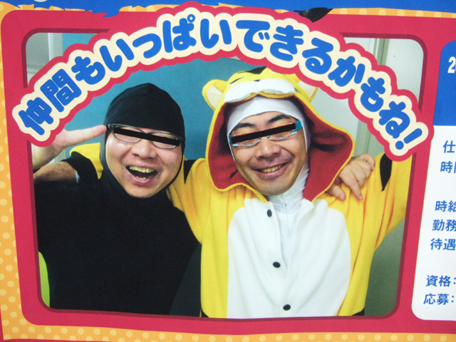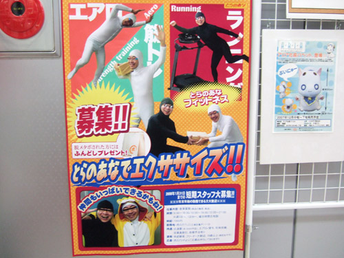 とらのあなでは、年末年始の繁忙期に備え、2008年1月31日までの短期スタッフの募集を行っていますが、とらのあな本店でもスタッフ募集の告知が掲示されていました。そのPOPにはなぜか「とらのあなでエクササイズ!!」とかかれ、全身タイツな方の就労イメージ?画像が。なお、POPによると、期間中に脱メタボしたら、ふんどしをプレゼントw 他、セール準備もしてました。
