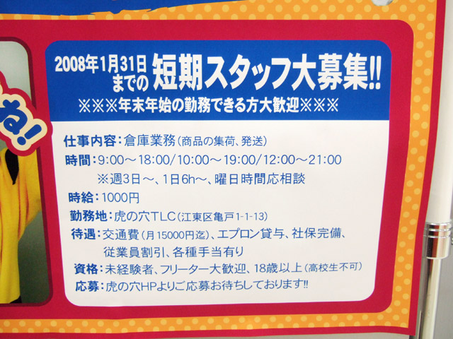とらのあなでは、年末年始の繁忙期に備え、2008年1月31日までの短期スタッフの募集を行っていますが、とらのあな本店でもスタッフ募集の告知が掲示されていました。