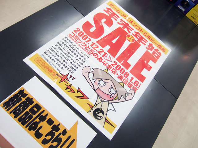そんな募集POPもあった、とらのあなでは、全国の店舗(秋葉原1号店・なんば2号店除く)で12月21日〜2008年1月6日まで、「ゲーム・アニメソフト&ホビー商品年末年始17DAYS!SALE」を開催するみたいで、とらのあな本店5Fではその準備のため、陳列棚が大きく開けられていました。