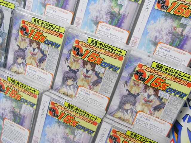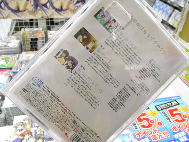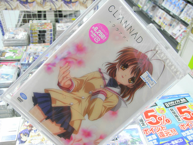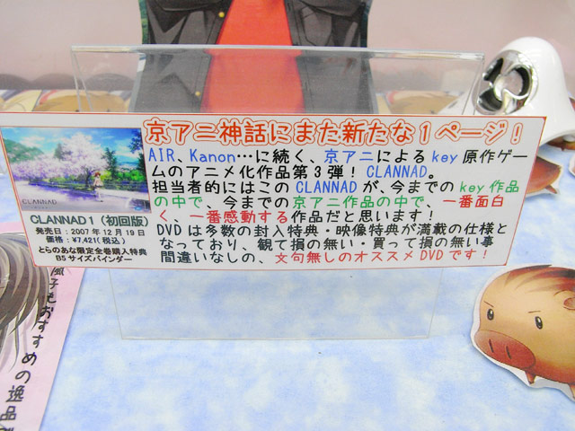 また、とらのあな本店のPOPでは『京アニ神話にまた新たな1ページ!AIR 、Kanon・・・に続く、京アニによるkey原作ゲームのアニメ化作品第3弾!CLANNAD。担当者的にはこのCLANNADが、今までのkey作品の中で、今までの京アニ作品の中で、一番面白く、一番感動する作品だと思います!DVDは多数の封入特典・映像特典が満載の仕様となっており、観て損の無い・買って損のない事間違いなしの、文句無しのお勧めDVDです!』とかかれていました。