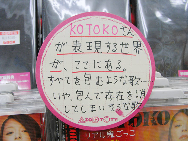 ゲームシティのPOPでは「KOTOKOさんが表現する世界が、ここにある。すべてを包むような歌・・・・・・いや、包んで存在を消してしまいそうな歌」とかかれていました。