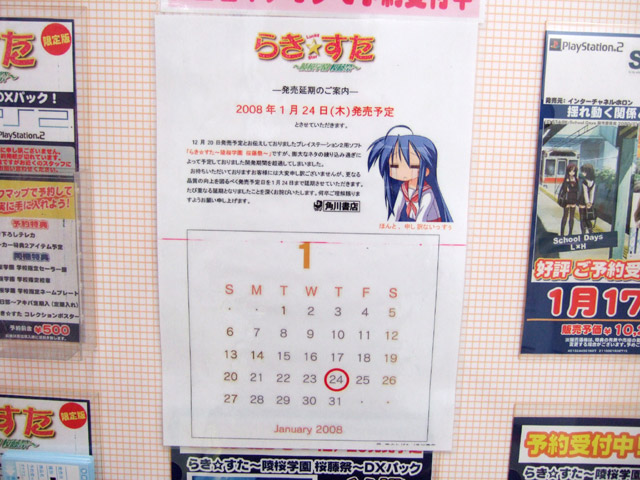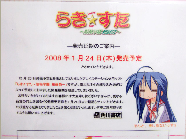 ソフマップアミューズメント館では、「らき☆すた 〜陵桜学園 桜藤祭〜」(AA)の発売延期告知が出ていました。