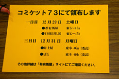 あと、「アクシア 赤」「ヴィオレット 橙」が販売される、冬コミ(コミックマーケット73)での卓番も掲示されていて、それによると