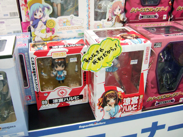 他、27日に上記2種の入荷を確認できたのは、ソフマップアミューズメント館、スーパーモデラーズ、とらのあな本店、ソフマップ秋葉原PCゲーム・アニメ館等で、マックスハルヒ(参考レビュー)は、3次出荷分でも減数(ショート)し、アキバでは初日でほぼ完売でしたが、流石に4次出荷は各店舗ともそれなりに落ち着いた感じで、店頭で普通に見かけることが出来ました。