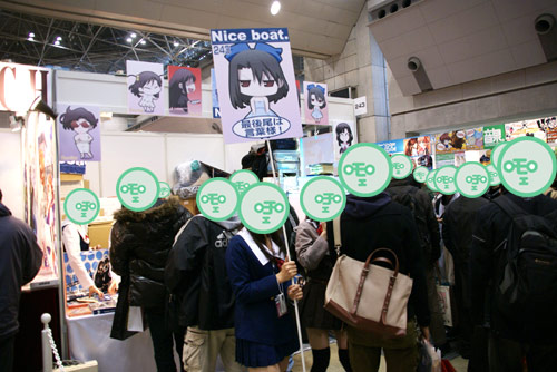 2007年12月29〜31日に開催された、コミックマーケット730verflowブースは、パンフレット配布開始の記事でお伝えしたように、都合により、ブース名を変更して、Nice boat.ブースとなっていて、長蛇の列となっていた購入列の途中のPOPには「最後尾ではありません」ではなく「最後尾は言葉様!」w 他、その言葉様のディフォルメフィギュアの参考展示も。
