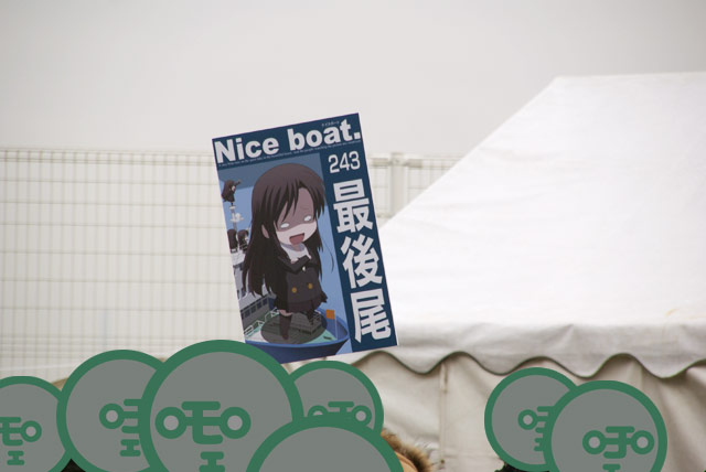 2007年12月29〜31日に開催された、コミックマーケット730verflowブースは、パンフレット配布開始の記事でお伝えしたように、都合により、ブース名を変更して、Nice boat.ブースとなっていて、長蛇の列となっていた購入列の途中のPOPには「最後尾ではありません」ではなく「最後尾は言葉様!」でしたw