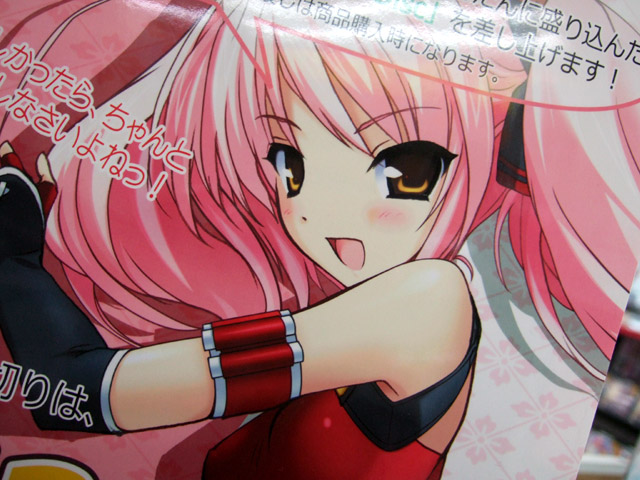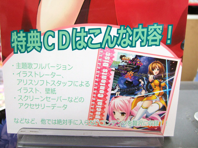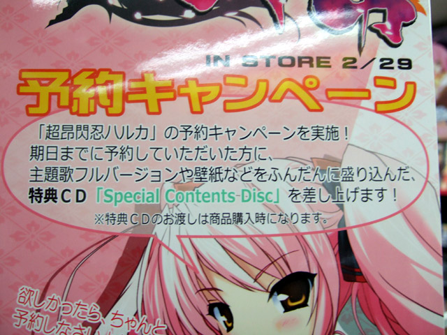 この告知POPによると『「超昂閃忍ハルカ」の予約キャンペーンを実施!期日までに予約していただいた方に主題歌フルバージョンや壁紙などをふんだんに盛り込んだ、特典CD「Special Contents Disc」を差し上げます!』とのことです。
