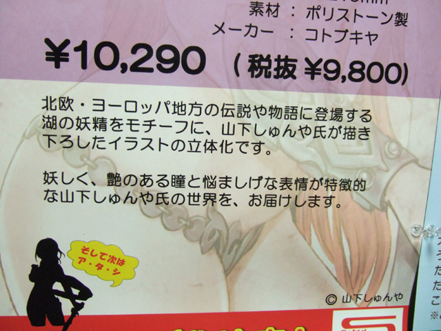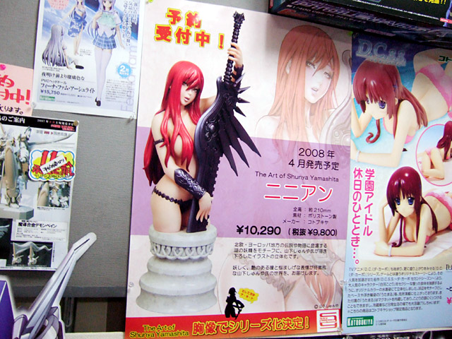 コトブキヤ「The Art of Shunya Yamashita ニニアン(コトブキヤショップ限定)」の予約告知ポスターの掲示がコトブキヤ秋葉原店にて開始されています。そのポスターには次回作のシルエットも。他、「ジャンプ SQ. 2008年 2月号」(AA)発売、「Fate/Zero Vol,4 -煉獄の炎-」のアキバでの在庫状況、等身大巫女セイバー等、今年初巡回の4日に見かけたもの等まとめて。