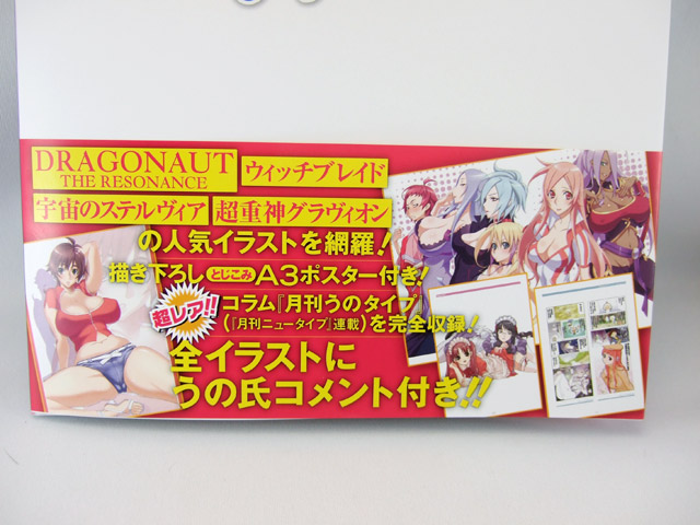 他、集英社の商品説明によると『稀代の絵師 うのまこと 初画集!!「DRAGONAUT -THE RESONANCE-」「ウイッチブレイド」「宇宙のステルヴィア」「超重神グラヴィオン」の人気イラストを網羅!描き下ろし とじこみ A3ポスター付き!超レア!! コラム『月刊うのタイプ』(『月刊ニュータイプ』連載)を完全収録!全イラストにうの氏のコメント付き!!』と紹介されているように、多数のフルカラーイラストが収録されていました。