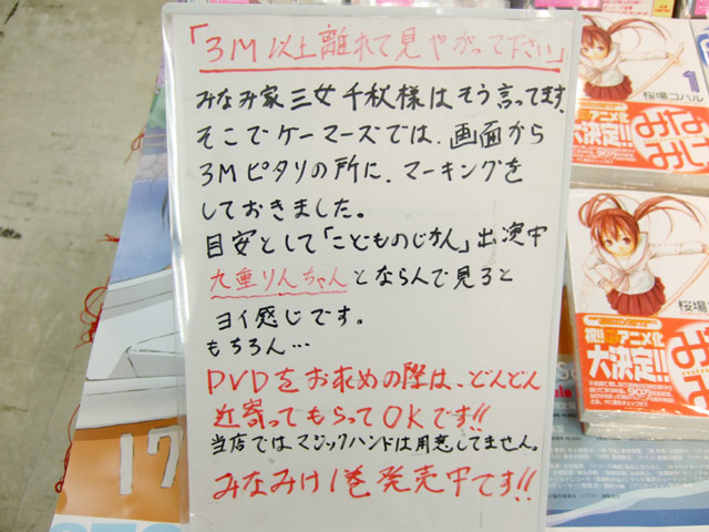 8日、DVD「みなみけ 1巻 (期間限定版)」(AA)が発売されました。ゲーマーズ本店2FではPOPで『「3M以上離れて見やがって下さい」みなみ家三女千秋様はそう言ってます。そこでゲーマーズでは、画面から3Mピタリの所に、マーキングをしておきました。』とあったので、確認してみたところ、本当にしてありましたw 他、8日に発売されていたものをまとめてお伝えします。