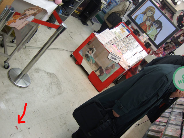 大きく引き伸ばされたPOPには「みなみけは3M以上離れてみやがれバカヤロー!」と書かれていて、別のPOPには『「3M以上離れて見やがって下さい」みなみ家三女千秋様はそう言ってます。そこでゲーマーズでは、画面から3Mピタリの所に、マーキングをしておきました。目安として「こどものじかん」出演中九重りんちゃんとならんで見るとヨイ感じです。もちろん・・・DVDをお求めの際は、どんどん近寄ってもらってOKです!!当店ではマジックハンドは用意してません。』と書かれていたので確認してみたところ、すげーちんまりとですが本当にしてありましたw
