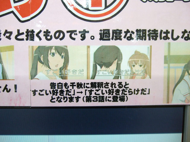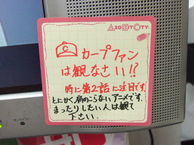 ゲームシティのPOPでは「カープファンは観なさい!?特に第2話に注目です。とにかく肩のこらないアニメです。まったりしたい人は観て下さい。」とかかれ、別のPOPでは「カープファン?(第2話に登場)」「もちろんカレーではありません!(第1話に登場)」「告白も千秋に解釈されると「すごい好きだ」→「すごい好きだらけだ」となります(第3話に登場)」とそれぞれの収録話のシーンを紹介していました。