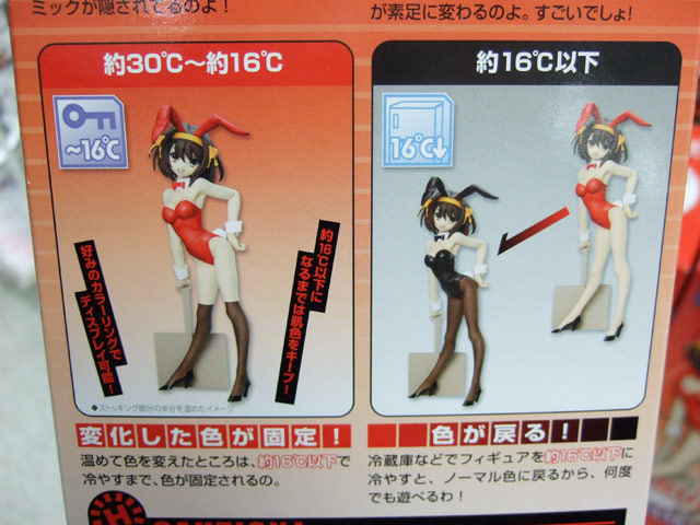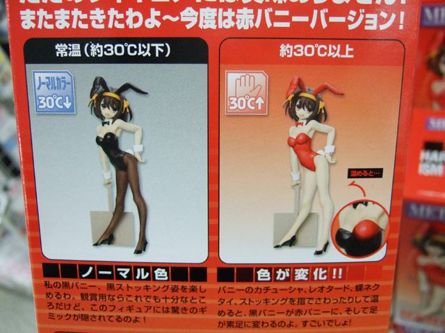 「わたし、ただのフィギュアには興味ないの」2007年5月に発売し市場に旋風を巻起こした『メタモフィギュア 涼宮ハルヒ バニーVer』が色替えVerで登場!温めると黒バニーコスチュームから赤バニーコスチュームにカラーチェンジ!ハルヒフィギュアの決定版!!