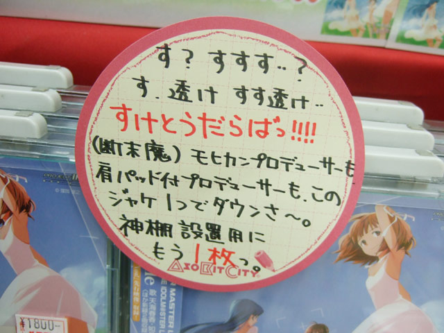 ゲームシティのPOPでは「す?すすす・・?す、透け すす透け・・すけとうだらばっ!!!!(断末魔)モヒカンプロデューサーも肩パッド付プロデューサーもこのジャケ1つでダウンさ~。神棚設置用にもう1枚っ。」「このペッタンコ具合はなんとゆーか・・・だんだんと平面に近付いてってないか?w だが!それが千早の魅力なんだ!まだこの先減らせるさ!がんばれ、ミンゴス!w」などと書かれていました。