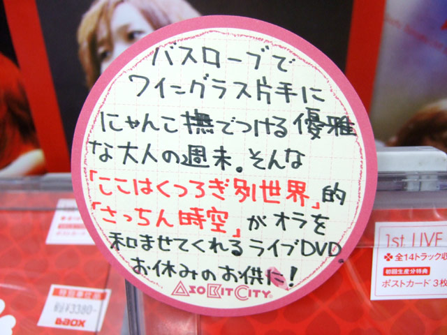ゲームシティのPOPでは「バスローブでワイングラス片手ににゃんこ撫でつける優雅な大人の週末。そんな「ここはくつろぎ別世界」的「さっちん時空」がオラを和ませてくれるライブDVD。お休みのお供に!」と書かれていました。