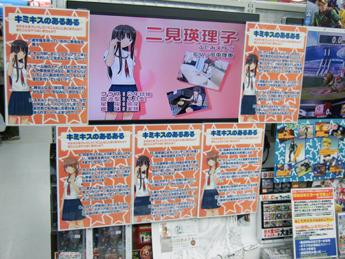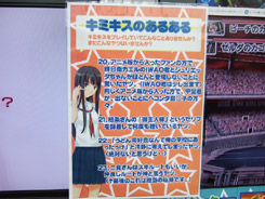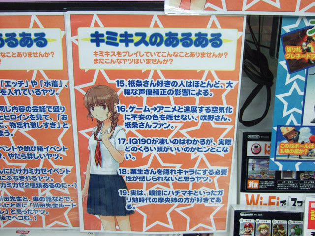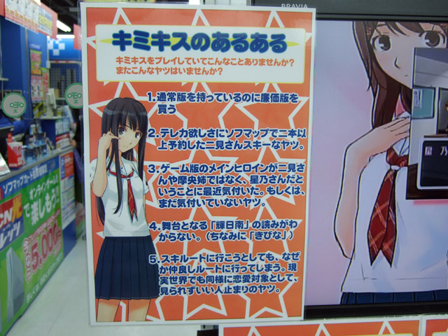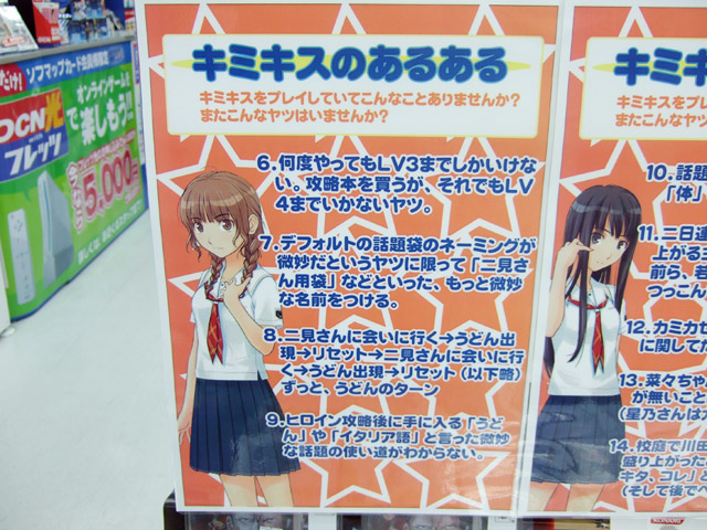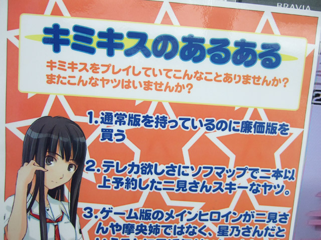 PS2キミキスの廉価版「eb!コレ+キミキス」(AA)が2月14日に発売ですが、ソフマップアミューズメント館店頭では、店頭デモが開始していて、その周りに「キミキスをプレイしていてこんなことありませんか?またこんなヤツはいませんか?」とした「キミキスのあるある」を、「二見さんはスキルートもいいが、仲良しルートが神と思う」等、23項目掲示していました。