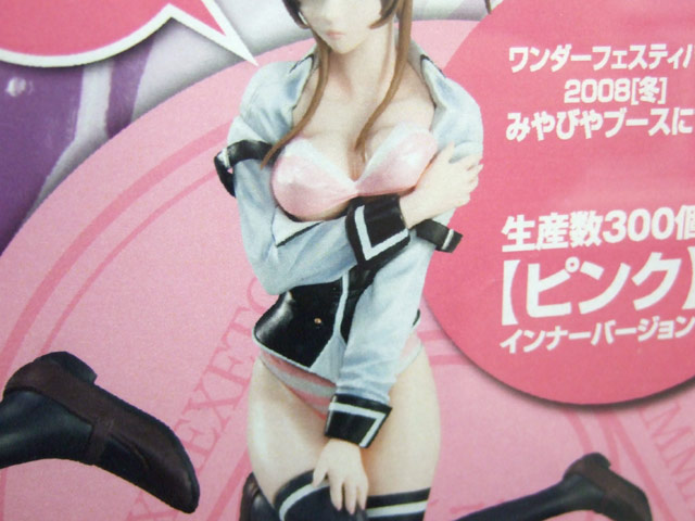 これは、以前サンプルレビューをお伝えした、「Bible Black」のキャラ「伊万里胡桃」をDVD「第三章 黒の生贄」(AA)のパッケージイラストをモチーフに、ブラ、スカートがキャストオフ可能な仕様で立体化した、「BibleBlack 伊万里胡桃」(AM)のカラバリとなるもので、みやびやの商品説明によると「300個限定生産のワンダーフェスティバル2008冬バージョン。伊万里胡桃のトレードマーク、縞パンのカラーバリエーションは、伊万里胡桃の魅力をさらに惹き立てる、ピンクのオリジナル仕様。」と紹介されています。