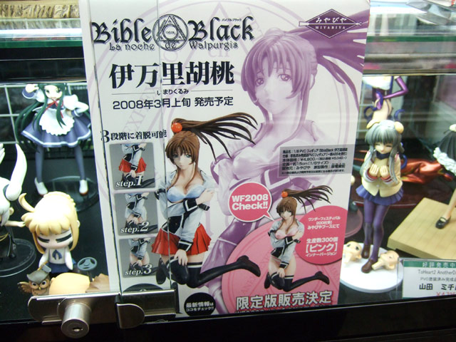 3月発売予定のみやびや「BibleBlack 伊万里胡桃」(AM)(サンプルレビュー)ですが、それより早く、ワンダーフェスティバル 2008[冬]にて、イベント限定の下着がピンクになったカラバリの「ピンクインナーVer.」が販売予定となっています。スーパーモデラーズでは、そのイベント限定版のサンプル展示が美少女フィギュアコーナーのショウケース内で開始していました。