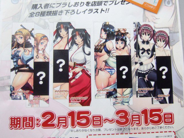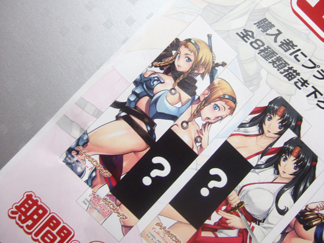 2月15日に、「おぬしら、待たせたのう!」という告知POPもあった、クイーンズブレイド「第9弾 鋼鉄姫ユーミル」(AA)と、「美闘士列伝 第二弾 古代王女の書」(AA)の2種が発売予定ですが、その15日から関連書籍購入で、クイブレのしおりがもらえるフェアの告知POPが、とらのあな本店にて掲示されてました。POPでは絵柄も公開してましたが、胴部分が?で隠されたイラストも。
