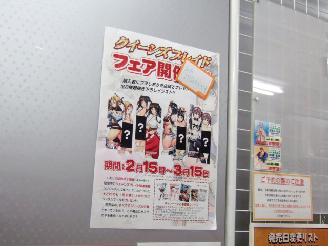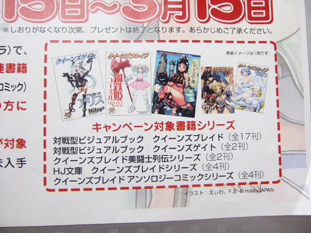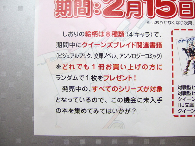 「クイーンズブレイドフェア」は、POPの説明によると「購入者にプラしおりを店頭でプレゼント!」「全8種類描き下ろしイラスト!」「しおりの絵柄は8種類(4キャラ)で、期間中にクイーンズブレイド関連書籍(ビジュアルブック、文庫ノベル、アンソロジーコミック)をどれでも1冊お買い上げの方にランダムで1枚をプレゼント!発売中の、すべてのシリーズが対象となっているので、この機会に未入手の本を集めてみてはいかが?」というものみたいです。