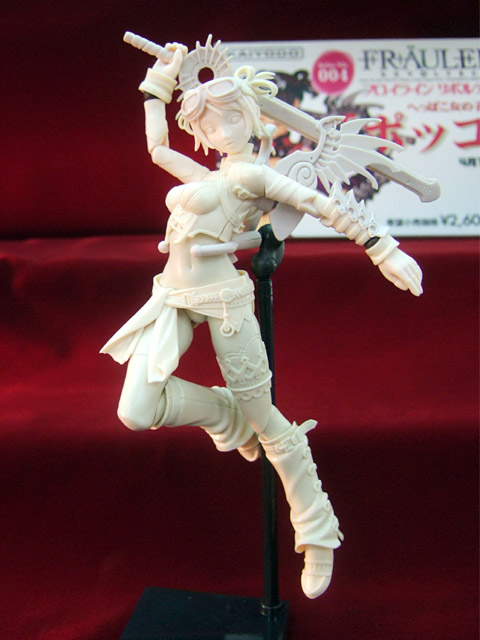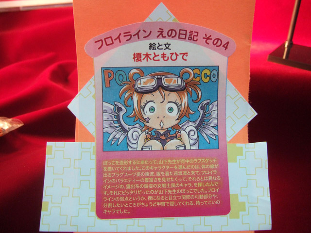 展示では、原型を担当された榎木ともひで氏のインタビューPOPもあり、それによると「ぽっこを造型するにあたって、山下先生が背中のラフスケッチを描いてくれました。このキャラクターを選んだのは、体の線が出るプラグスーツ姿の綾波、服を着た遠坂凛と来て、フロイラインのバラエティーの豊富さを見せたくって、それらとは異なるイメージの、露出系の鎧姿の女戦士風のキャラ、を探したんです。それにピッタリだったのが山下先生のぽっこでした。フロイラインの弱点というか、裸になると目立つ関節の可動部分や、分割したいところがちょうど甲冑で隠してくれる、持ってこいのキャラでした。」とのことです。