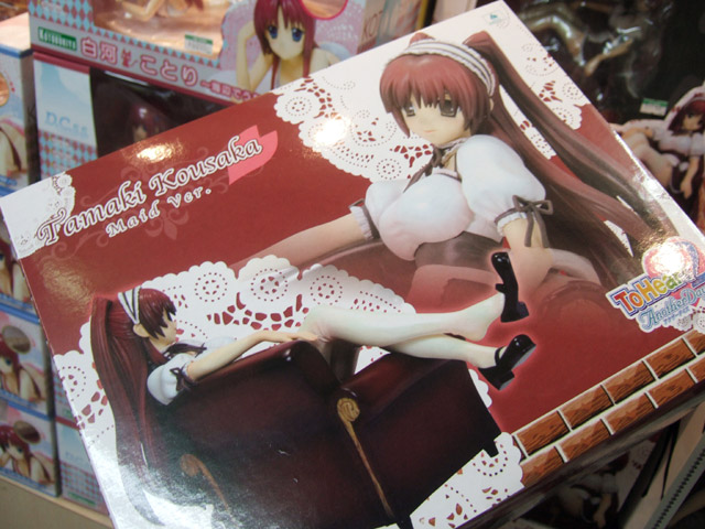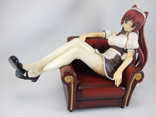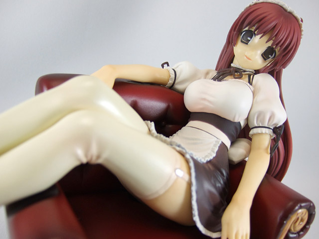 これは、以前サンプル展示もお伝えした、パンツずりさげな「柚原このみ メイドVer.」(RA)(参考サンプルレビュー)に続く、2007年4月に一般発売された画集「Leaf Illustrations 甘露樹EDITION」収録の、甘露樹氏描き下ろしメイドタマ姉イラストをベースにタマ姉を立体化したと思われる、コトブキヤのToHeat2メイドシリーズ第2弾となるもので、コトブキヤの商品説明によると『「ToHeart2AnotherDays」メイドシリーズ第2弾!!向坂環の登場です!重厚なソファーに横たわり挑発的な眼差しを向ける姿は、ファンならずとも感涙ものの仕上がりとなっております!また、フィギュア本体はもちろん作り込まれたソファー等、細部にまでこだわった本商品。ぜひ手に取ってご覧になってください☆』と紹介されています。