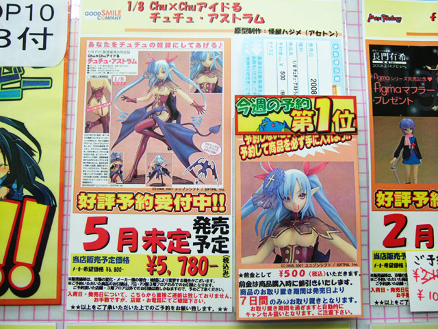 ソフマップ秋葉原PCゲーム・アニメ館で毎週更新されている、「週間予約ランキングTOP10」の1/28~2/2付分をお伝えします。今週も、先週に引き続き、グッスマ「チュチュ・アストラム」(AA)がTOP。やはり強いですね~!w 2位には先着でマフラーパーツプレゼントが公表された「Figma 長門有希 制服ver.」(AA)が2位に上昇。フロイライン第4弾「ポッコ」(AA)は5位に。