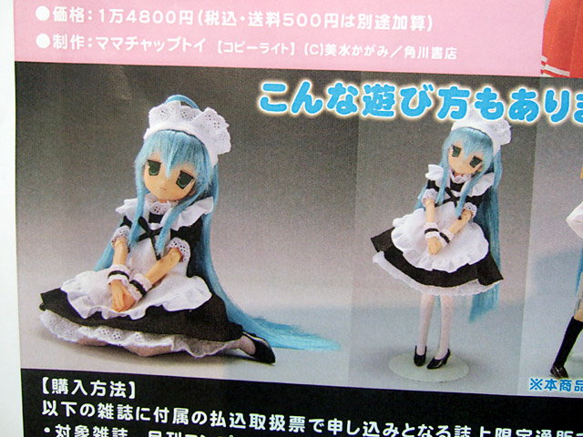 1人1体限定(おそらく違う雑誌の応募でも1体限定と思います。 Anonymous(無記名)さんのコメントによると、1枚の申込用紙で1体という意味で、申し込み用紙さえあれば一人何体でもOKみたいです)で、締め切りは2008年2月25日。発送は2008年6月下旬予定みたいです。