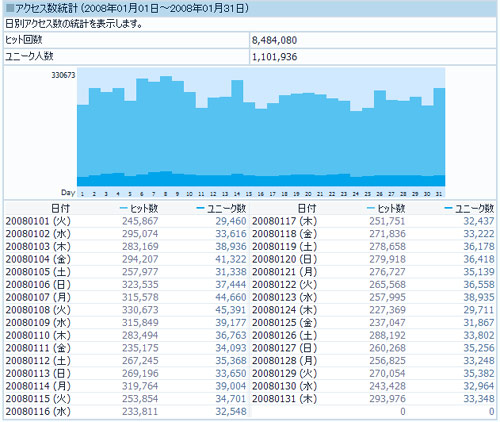 総ヒット数は848万4080。総ユニーク数は110万1936でした。トップページへのアクセス154万1349PV。(内、新環境トップは153万1098、旧ライブドアブログトップは1万251)
