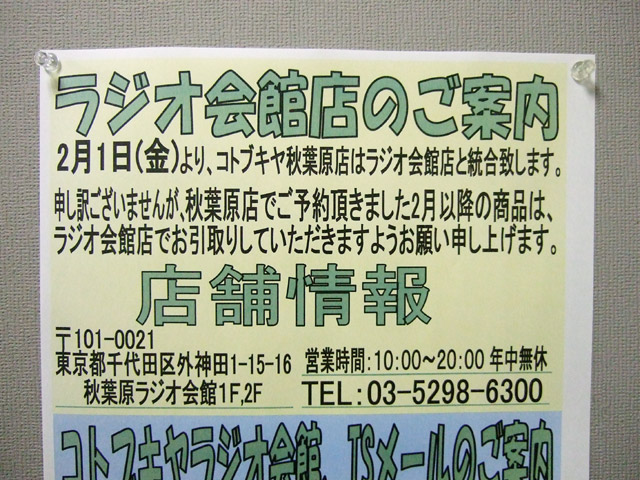 以前完全閉店セール告知をお伝えしたように、コトブキヤ秋葉原店店が、コトブキヤラジオ会館との合併のため、1998年12月のオープンから約9年となる、2008年1月31日をもって閉店しました。