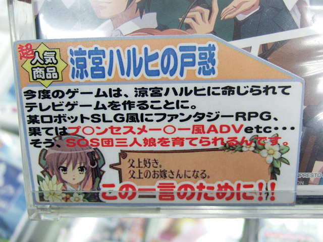 もうひとつのPOPでは、『今度のゲームは、涼宮ハルヒに命じられてテレビゲームを作ることに。某ロボットSLG風にファンタジーRPG、果てはプ○ンセスメー○ー風ADV etc・・・そう、SOS団三人娘を育てられるんです。「父上好き。父上のお嫁さんになる。」この一言のために!!』とかかれ、長門が「父上好き。父上のお嫁さんになる。」といっているシーンを掲示していましたw