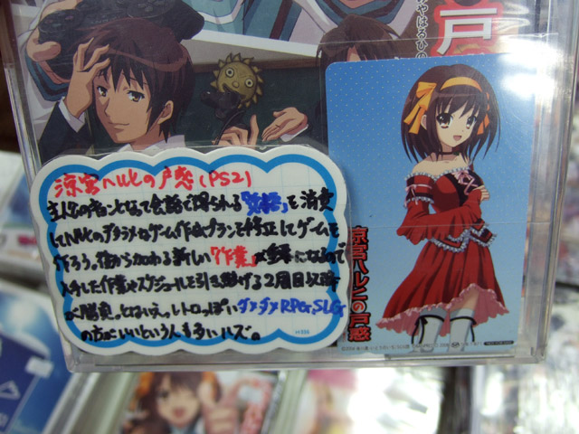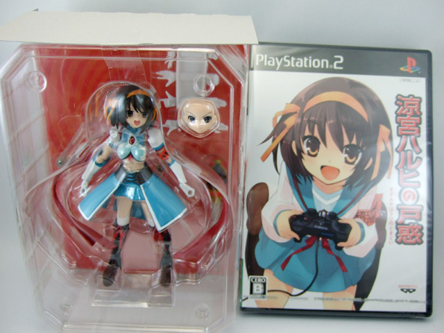 これは、以前巨大POPをお伝えし、キャラホビ2007でサンプル展示もあった、「figma」の実質第1弾となる「超勇者ハルヒ」が付属した、PS2のゲームで、ソフマップのPOPによると『主人公キョンとなって会話で得られる「愛嬌」を消費してハルヒのデタラメなゲーム作成プランを修正してゲームを作ろう。後から加わる新しい「作業」が重要になるので入手した作業やスケジュールを引き継げる2周目以降が勝負。とはいえレトロっぽいダメダメRPG、SLGの方がいいという人も多いハズ。』と紹介されています。