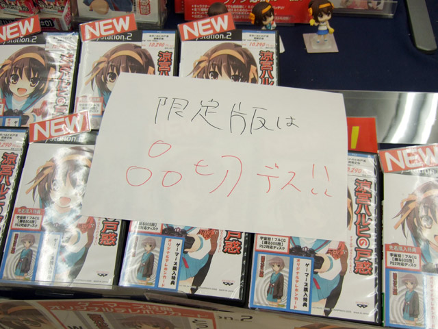 巡回した夕方に「涼宮ハルヒの戸惑 超限定版」(AA)の在庫を確認できたのは、ソフマップアミューズメント館、メディアランドのみで、ゲームシティ、ゲーマーズ本店、とらのあな本店、メッセサンオー、ヨドバシakibaでは一般販売分は完売となっていました。
