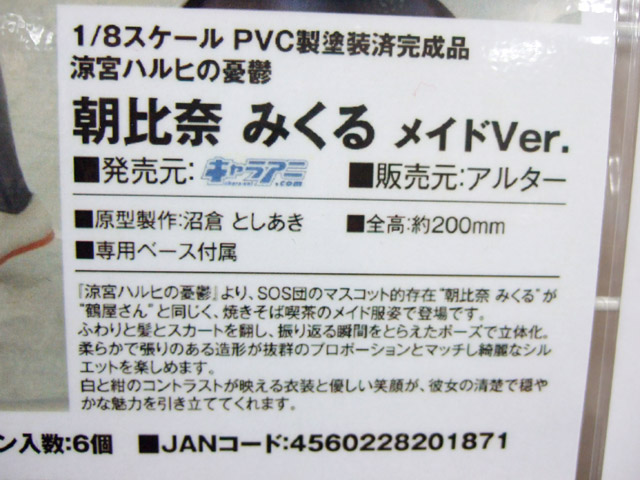 これは、販売アルター、発売キャラアニとなる、朝比奈みくるを、2007年11月に発売された、「涼宮ハルヒの憂鬱 鶴屋さん メイドVer.」(AA)(参考レビュー)同様のウェイトレス姿で立体化したもので、POPの商品説明によると「『涼宮ハルヒの憂鬱』より、SOS団のマスコット的存在”朝比奈みくる”が”鶴屋さん”と同じく、焼きそば喫茶のメイド服姿で登場です。ふわりと髪とスカートを翻し、振り返る瞬間をとらえたポーズで立体化。柔らかで張りのある造型が抜群のプロポーションとマッチし綺麗なシルエットを楽しめます。白と紺のコントラストが映える衣装と優しい笑顔が、彼女の清楚で穏やかな魅力を引き立ててくれます。」と紹介されています。