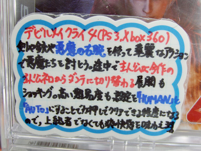 ソフマップアミューズメント館のPOPでは『剣や銃や悪魔の右腕を使って華麗なアクションで悪魔たちを討とう。途中で主人公が今作の主人公ネロからダンテに切り替わる展開もショッキング。高い難易度も認定を「HUMAN」と「AUTO」にすることで力押しでクリアできる程度になるので、上級者でなくても爽快感を味わえます。』と書かれていました。