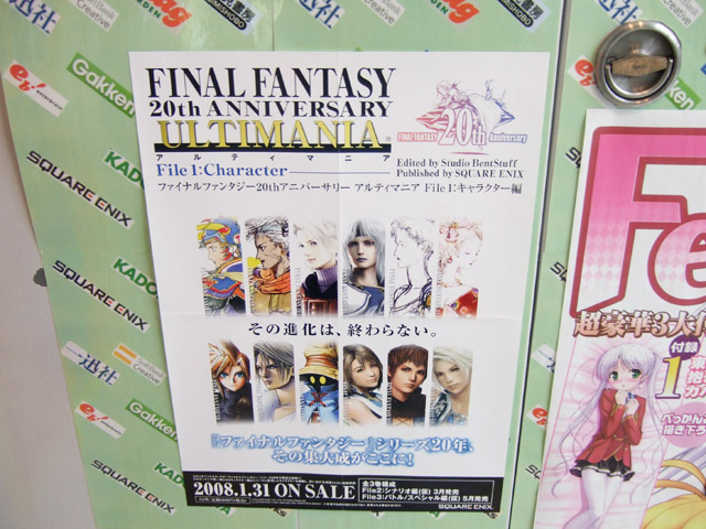 すでにチラシ等で告知されているのでご存知のかたもいらっしゃると思いますが、弊社では現在、『FF』の20周年をアルティマニアらしい濃密さで振り返る書籍「ファイナルファンタジー 20thアニバーサリー アルティマニア」シリーズ(編集・執筆:スタジオベントスタッフ/監修・発行:スクウェア・エニックス)を制作中です。その第一弾となる「ファイナルファンタジー 20thアニバーサリー アルティマニア File1:キャラクター編」(税込予価:1,800円)の発売日が、2008年1月31日に正式に決定しました。この本では、『FFI』から『FFXII』までに登場した千数百人にもおよぶキャラクターを、数々のオフィシャルイラストやCGとともに、濃厚なテキストでくわしく解説していきます。もちろん、企画物やインタビューなどもバッチリ収録。オールカラー512ページでお届けするこのメモリアル本があれば、キャラクターという視点からファイナルファンタジー20周年をたっぷりと回顧していただけることでしょう。ここ数日、実際のページがぞくぞくと完成してきているのですが、まさしくこの本だからこそ実現できた、歴代キャラクターたちによる夢のコラボレーションとも言える内容に、スタッフ一同、かなりの手応えを感じています。ご自身がプレイした『FF』シリーズの作品を大切な記憶としてとどめておくために、本書をお手元にお持ちいただけたらうれしいです。
