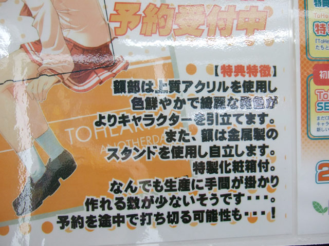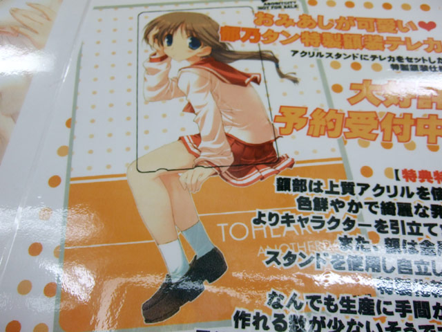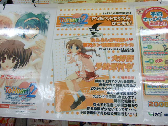 また、ちゃんと販促らしく、ディスプレイの周りには、「ToHeart2 AnotherDays 初回限定版」(AA)のアソビット購入先着特典の「おみあしが可愛い♥郁乃タン特製額装テレカ」の告知も。