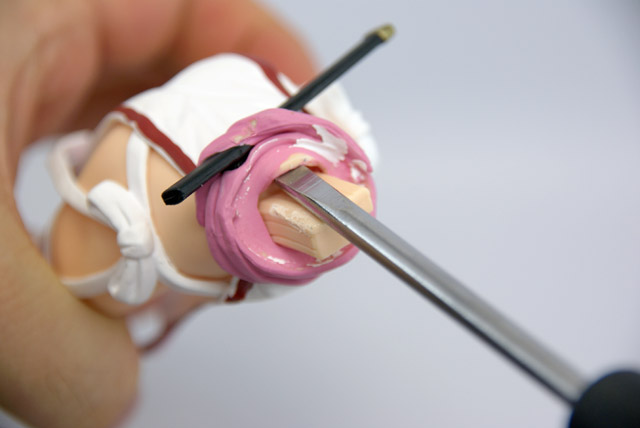 次に、コスの肩口にある分割線から丁寧に接着を剥がしていきます。