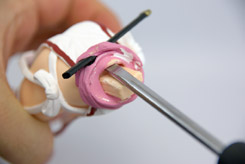 その後、胴部分をくの字に曲げ、ダボ穴が見えるようになったら、右図のように、マイナスドライバーを差し込んで上下分割します。