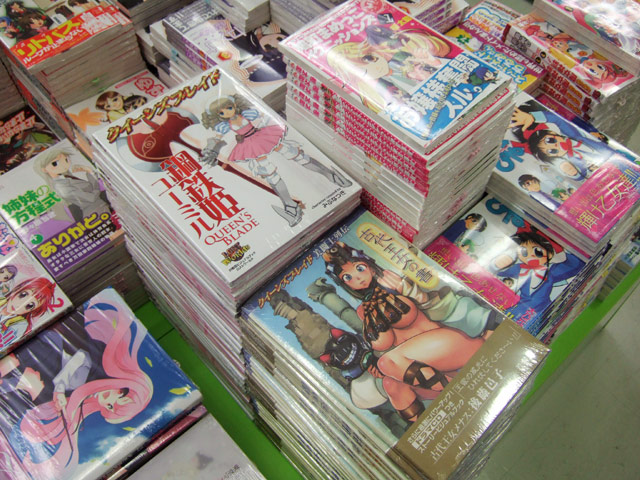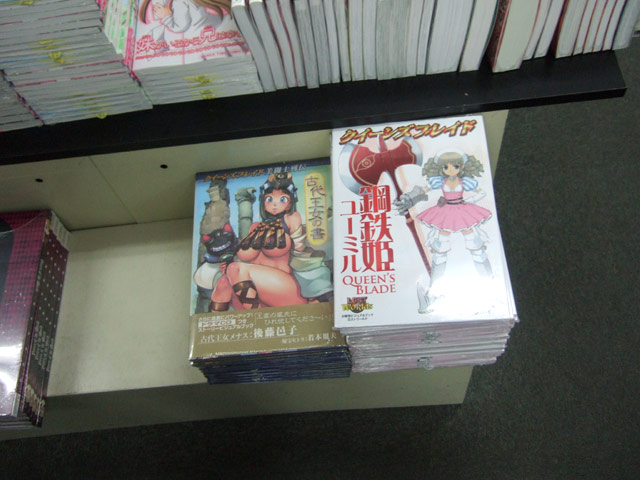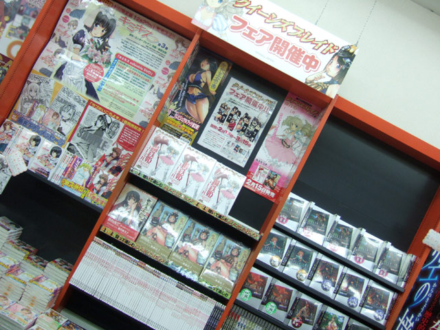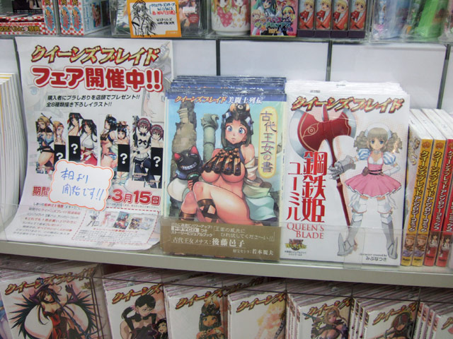 とらのあな1号店と、とらのあな本店でも13日に入荷していて、以前お伝えしたPOPによると「購入者にプラしおりを店頭でプレゼント!」「全8種類描き下ろしイラスト!」「しおりの絵柄は8種類(4キャラ)で、期間中にクイーンズブレイド関連書籍(ビジュアルブック、文庫ノベル、アンソロジーコミック)をどれでも1冊お買い上げの方にランダムで1枚をプレゼント!発売中の、すべてのシリーズが対象となっているので、この機会に未入手の本を集めてみてはいかが?」という「しおりプレゼントフェア」も13日に開始していて、とらのあな1号店では、対象関連書籍をまとめた特設コーナーも設けられていました。