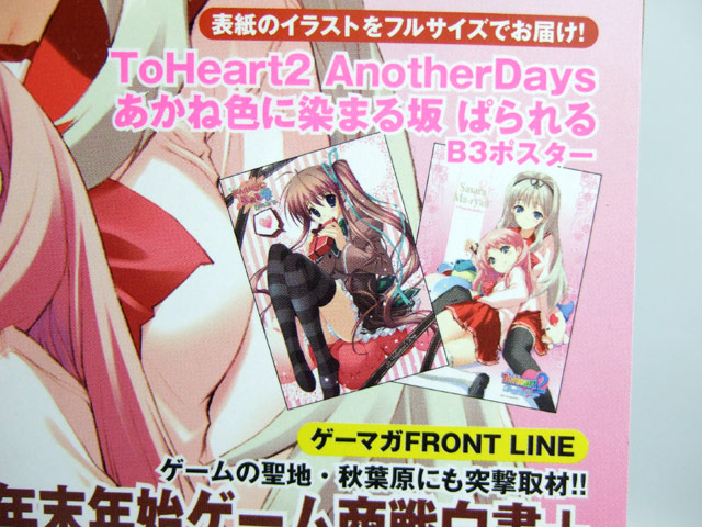 表紙には、以前サンプル展示をお伝えした「FORTUNE ARTERIAL」の「千堂瑛里華」フィギュアの誌上通販告知や、付録の「ToHeart2 AnotherDays」「あかね色に染まる坂 ぱられる」リバーシブルB3ポスターの絵柄などが掲載されています。