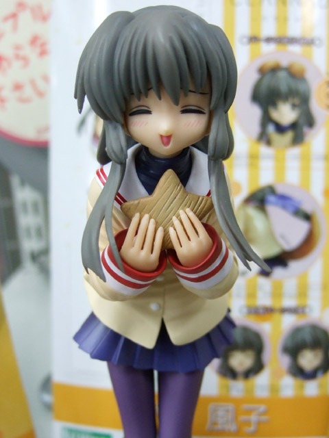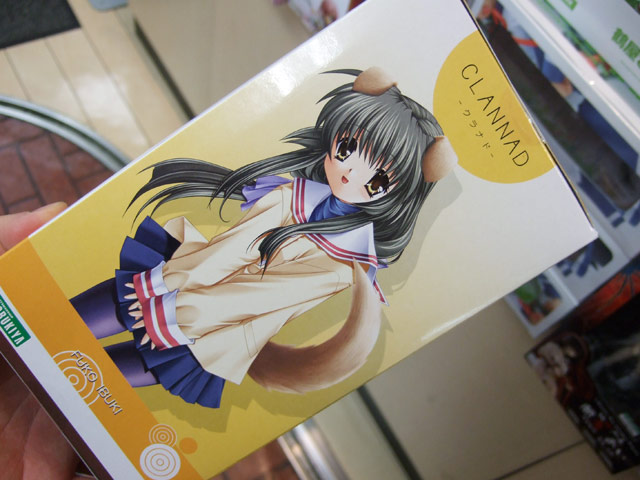 これは、以前サンプルレビューもお伝えしたことのある、「CLANNAD」のキャラ「伊吹風子」を立体化したもので、コトブキヤの商品説明によると『TV・映画と何かと話題のアニメーション「CLANNAD」より、「伊吹風子」が登場です。ほんわか笑顔でヒトデの彫刻を胸元に添える姿は、彼女のキャラクターを存分に引き出した作品に仕上がっています。付属の着脱式ケモノ耳と尻尾で「くらにゃどモード」も再現することが可能!さらに別表情が2種類もついてきちゃいます!ボリューム満点の「風子」をお見逃しなく!!!』と紹介されています。