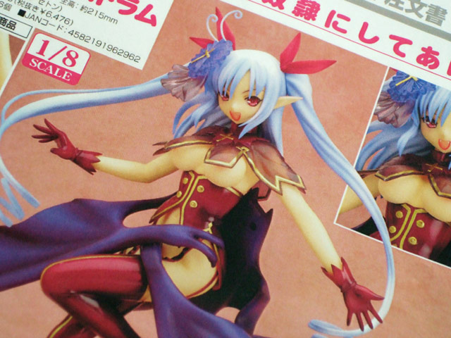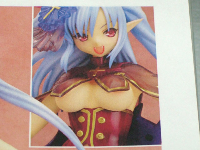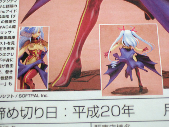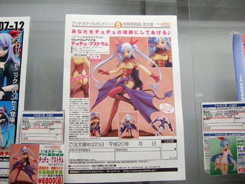 これは、以前ソフマアミュでの週末限定展示の様子をお伝えした、ユニゾンシフトのエロゲ「Chu x Chuアイドる」(AA)のキャラ「チュチュ・アストラム」を、はいてないコスで立体化したもので、グッスマの商品説明によると「2007年3月に発売、同11月には続編ともいえるファンディスクが発売され、何かと話題のPCゲーム『ChuxChuアイドる』より、エロかわ吸血鬼「チュチュ・アストラム」の登場です。好評を博した『WAGA魔々かぷりちお』の「メリッサ・セラフィ」に続き、原画家織澤あきふみ氏によるイラストを見事に再現しました。設定を忠実に再現した結果、胸周りはクリアパーツでスケスケ。下半身に巻きつくコウモリは、腕が自由に動くベンダブル仕様で、巻きつけ方は思いのまま。」と紹介されています。