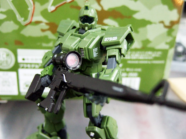 これは、電撃15年祭サンプル展示のあった、「機動戦士ガンダム 第08MS小隊」に登場するMS「ジムスナイパー」をハイコンとして立体化したもので、Amazonの商品説明によると「専用武器で希少性アップ!スコープ精密再現。射的射姿勢のための専用ハンド付き。本体とほぼ同じサイズ。ロングレンジ・ビーム・ライフル付属!GM同梱品からスナイパー専用品まで豪華セット。マシンガン+シールド装備、マシンガンハント装備、アンブッシュ用シート。スナイパー専用マーキングでカスタム感アップ!」と紹介されています。