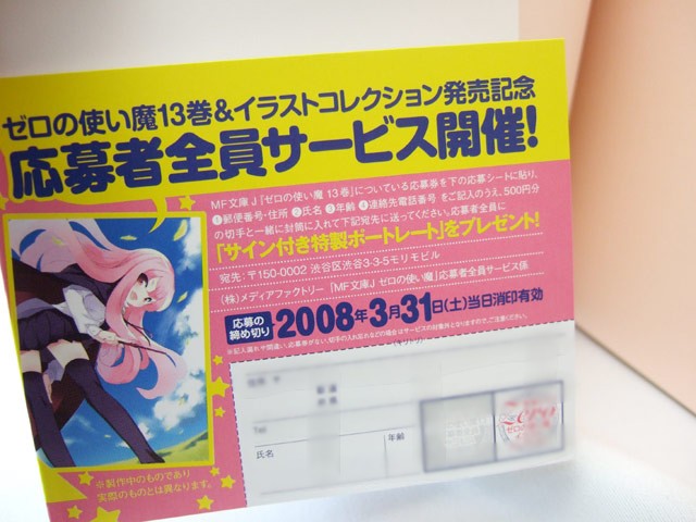 また、オビの折り返し部分には、ゼロの使い魔13巻&イラストコレクション発売記念応募者全員サービスとして、「サイン付き特製ポートレート」があたる全プレ用の応募用紙がありました。応募締め切りは、2008年3月31日みたいです。