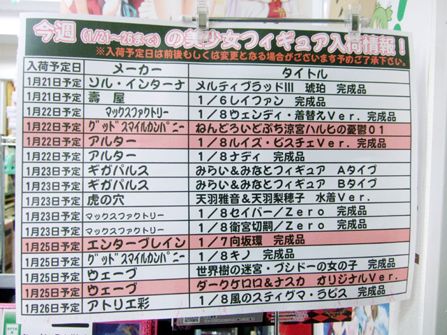 キャラシティでも、1月後半の入荷予定表の掲示が開始していました。